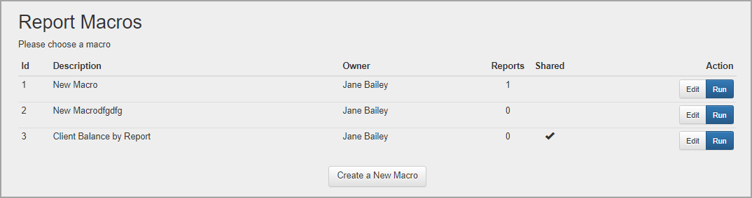 Any existing macros are displayed in the Report Macros page. Macros can be run or edited by clicking the applicable button.