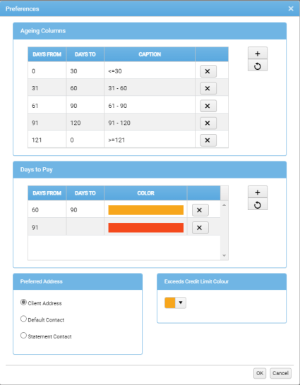 In the Ageing Columns region, each grid row configures an AGEING column in the Client List. Here, you can specify the age ranges for a maximum of seven Ageing columns, and enter a meaningful Caption (column header) for each.